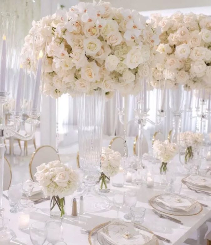- Classic Black-Tie: Elegant linens, chandeliers, and statement florals